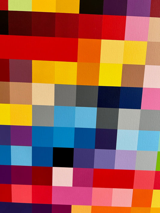 He uses spray paint to create his mesmerising hardedge paintings (areas of flat colour with sharp, clear, hard edges) which he better describes as "shapes and colourful interactions, a jigsaw of spontaneous thoughts, journey into the unknown."