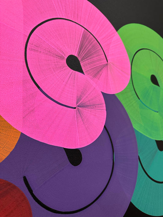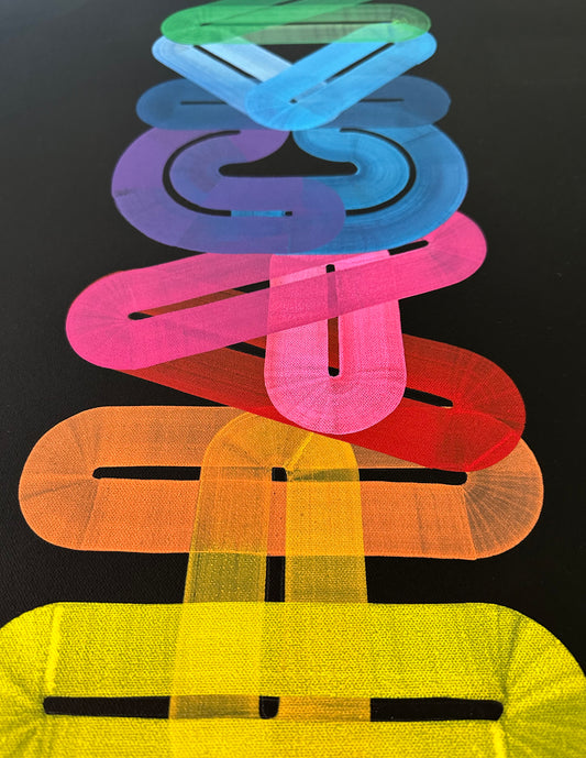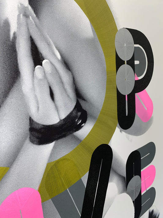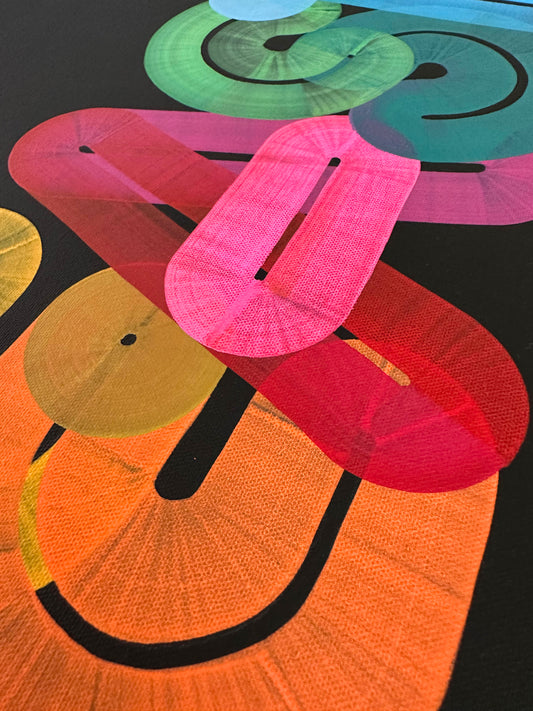 Characterised by their precision and perfection, each pristine print is a testament to Dave’s talent. We love how there is not a line out of place when it comes to his compositions. Using 30mm wide acrylic markers in semi-opaque colours, Towers draws directly onto canvas, creating layered geometric and typographic compositions with texture, depth, and a dynamic Pop spirit.