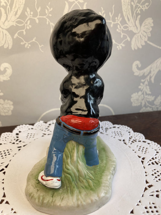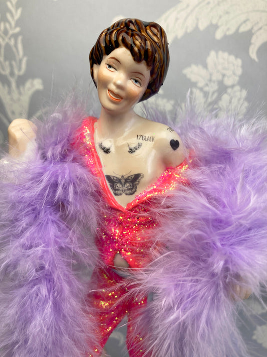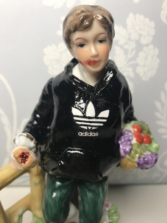 Lucy applies the same principle to her ceramics; she takes unloved, forgotten-about chintzy kitsch figurines and breathes new life into them. A young woman feeding geese is transformed into a skateboarder, a lady dressed in Victorian finery wields a chainsaw and a small baby buys drugs from the dark web using a stolen credit card. There is something for everyone!